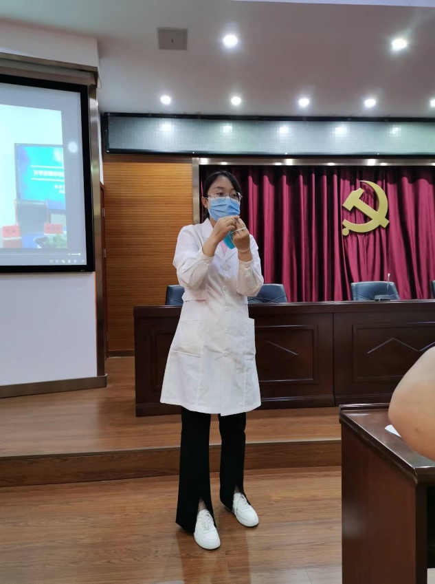 培训中,学院王少华大夫为志愿者们授课。王大夫从专业角度深入细致地为大家讲解了新冠肺炎的基本知识和一线志愿服务工作人员日常防控操作技能。她结合《开学复课学校医务人员线上培训》视频,给每一位志愿者分发了防护用品,现场带领大家实操七步洗手法、口罩、面罩、手套、防护服等的正确穿戴方法,引导大家掌握个人防护知识,志愿者们认真听,用心记,互帮互助,纷纷按照要求和步骤,参与防护服的穿脱练习,一起理解消化培训所学知识。