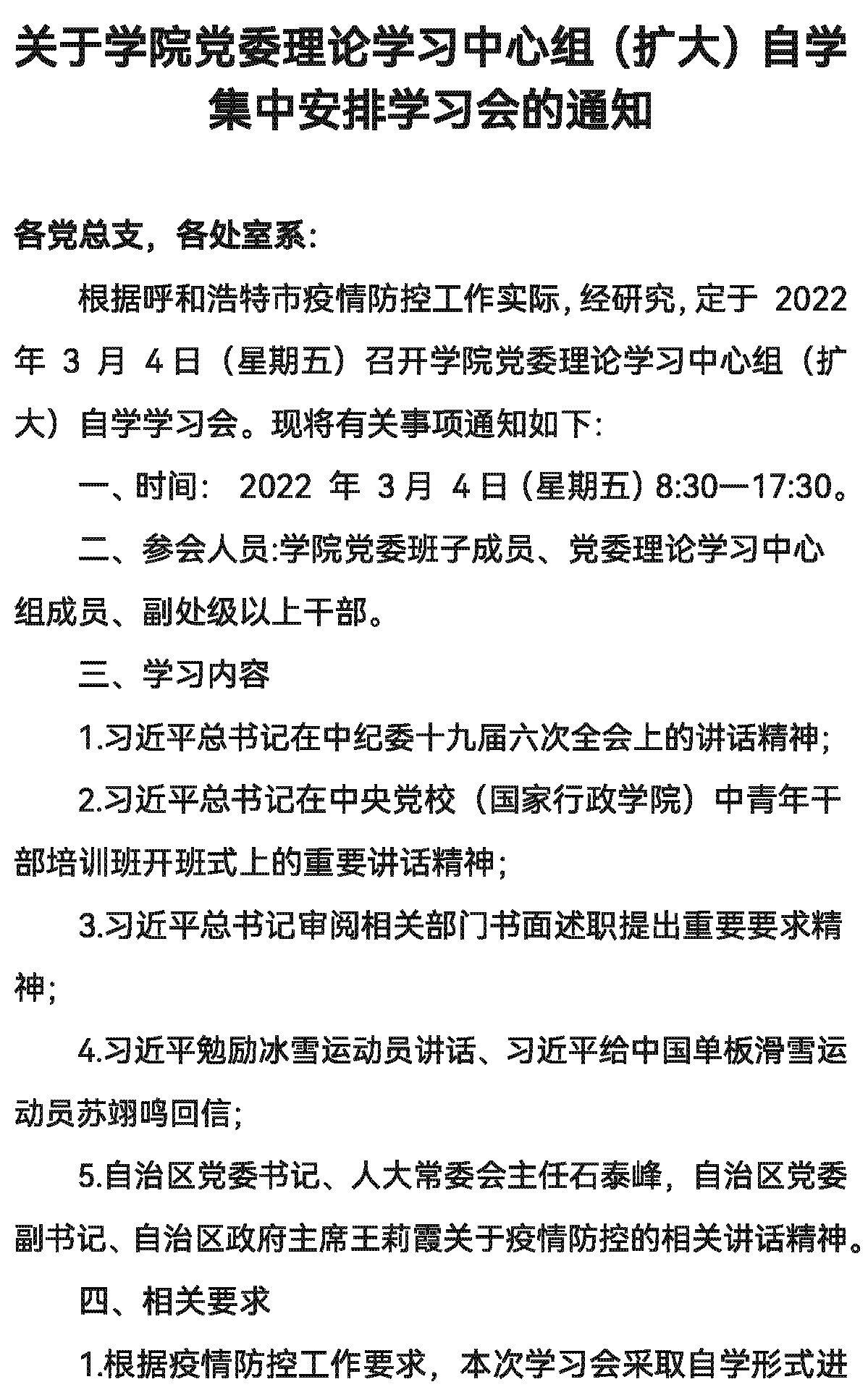 关于学院党委理论学习中心组(扩大)自学集中安排学习会的通知