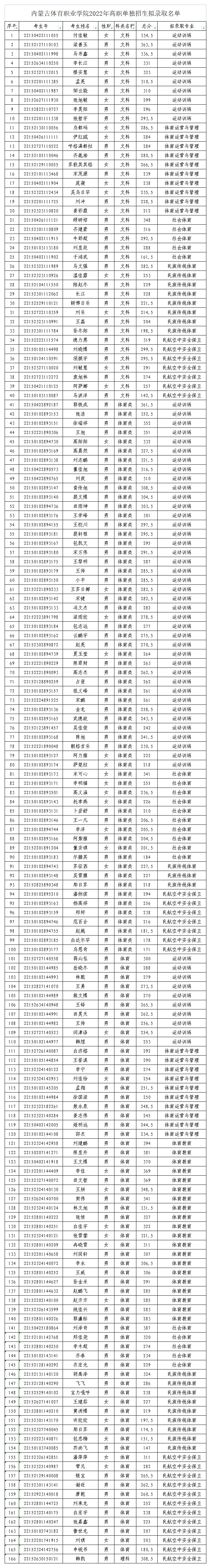 根据《关于做好2022年高等职业院校单独考试招生工作的通知》(内教招考普〔2022〕2号)的文件精神和《beat365官方网站2022年单独考试招生实施方案》的工作安排,学院2022年单独考试招生工作领导小组召开会议,根据专业志愿清录取原则,对beat3652022年单独考试招生拟录取名单进行审核,经审核,决定对166名考生拟录取,现予以公示。待内蒙古教育招生考试中心审核后,正式录取名单在内蒙古招生考试信息网公布。beat3652022年单独考试招生录取通知书拟于2022年8月统一邮寄。