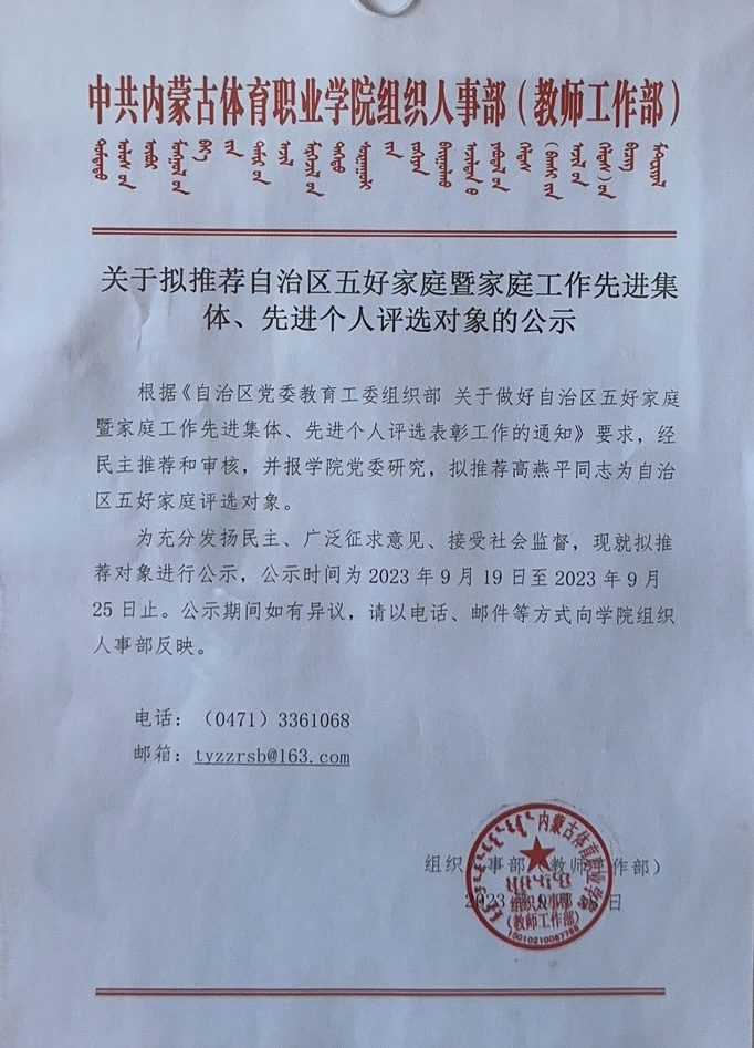 关于拟推荐自治区五好家庭暨家庭工作先进集体、先进个人评选对象的公示