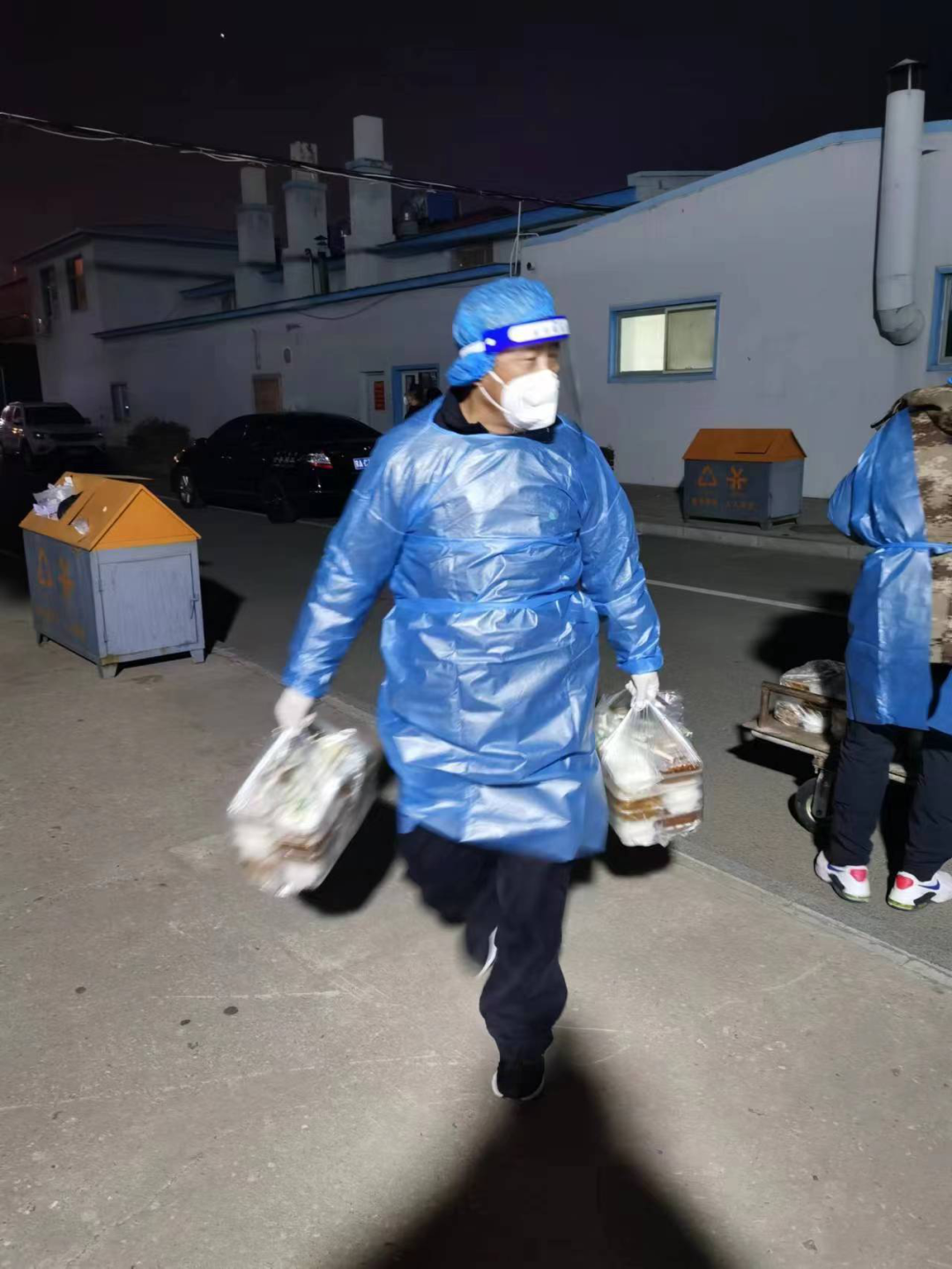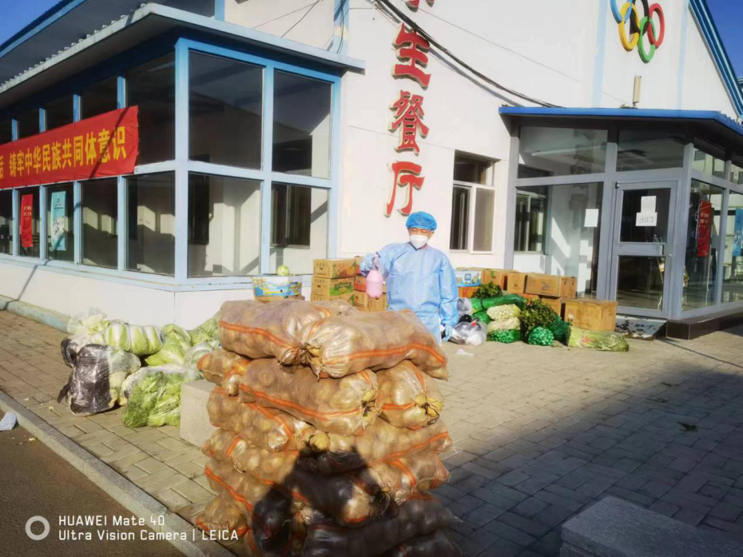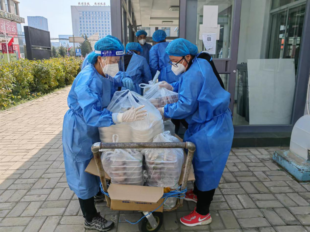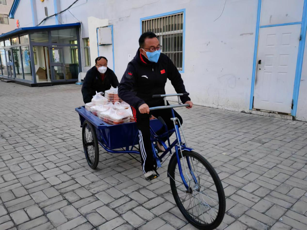 驻校的教职工,像传递接力一样,从食堂到女生宿舍、北方足球训练基地,按照送餐程序分送到每个同学手中。搬运过程很辛苦,一袋袋饭菜承载着老师们的责任与担当,传递着对学生的关心与关爱。送饭、送水路上、楼梯上、开水间到处是他们留下的身影。一线的老师们,穿着防护服,不知疲倦地楼上楼下每天不知跑多少趟,送餐完毕已经是汗流浃背。他们自从进驻学校以来,从未吃过热乎的饭菜,从未按点吃过饭,他们的辛勤付出只是为了争取时间,及时地将热乎乎的饭菜送达学生手中。