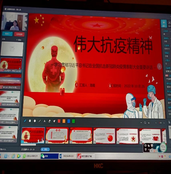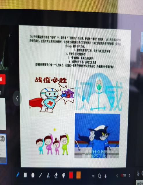高婧老师以思政课程为主阵地,以学院抗疫故事为素材,向同学们讲述了老师们化身“大白”奋战在一线不辞辛苦、默默奉献,日夜辛劳守护体院学子的感人故事。同时,同学们分享了疫情期间的感人事迹,引导学生感恩抗“疫”中每一位坚守在岗位上的老师。课上以鲜活的抗“疫”故事涵养学生坚定“四个自信”,让学生正确理解目前疫情管控措施,避免谣言和恐惧心理,坚定抗击疫情的信心。