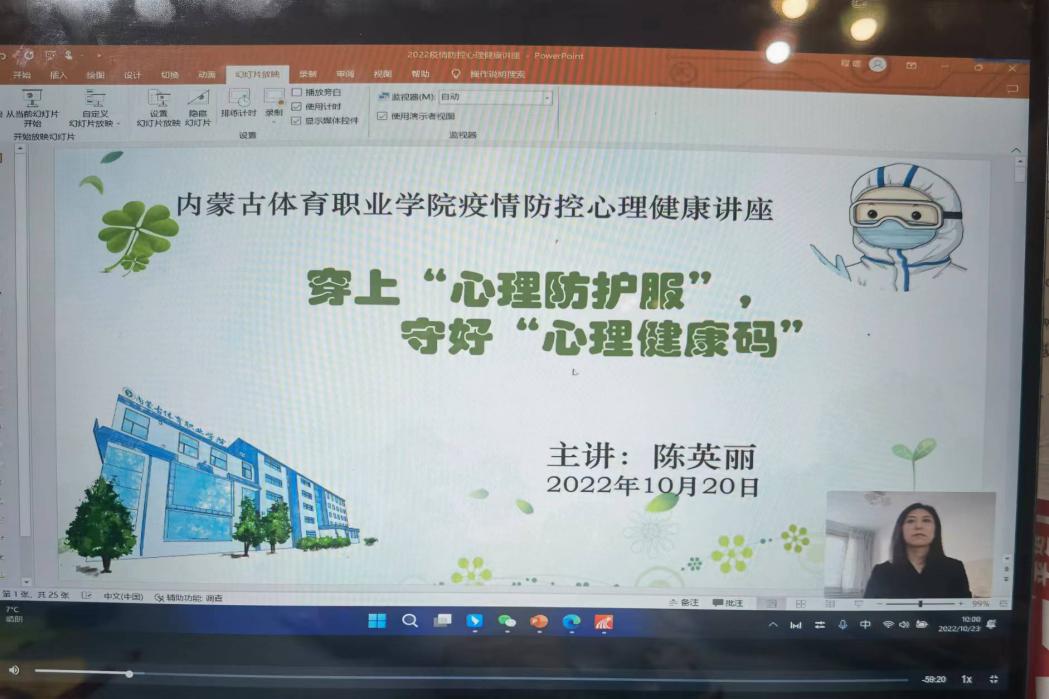 陈英丽老师为学院师生开展——穿上“心理防护服 守好“心理健康码”的专题讲座,通过分享调整心态、稳定情绪的心理调适方法,引导师生积极应对疫情,齐心协力,取得校园疫情防控的最终胜利。