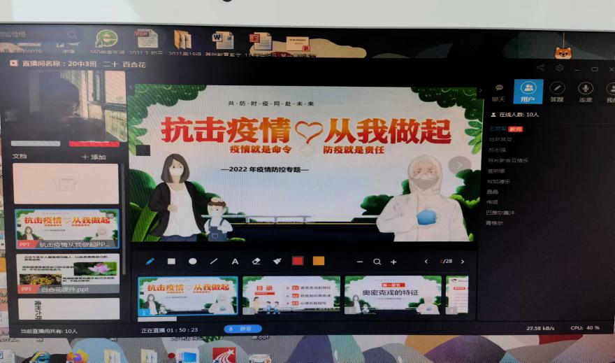 基础教育系全体教师立足课堂主阵地,充分发挥课堂主渠道的作用,讲好伟大抗疫精神、讲好身边战“疫”故事,将疫情防控与课程内容相融合,形成防疫教育教学内容,使教学与学生思想工作同向同行,凝聚beat365战“疫”信心、传递beat365战“疫”力量,引导学生与老师同舟共济筑防线,坚决打赢这场疫情防控阻击战。
