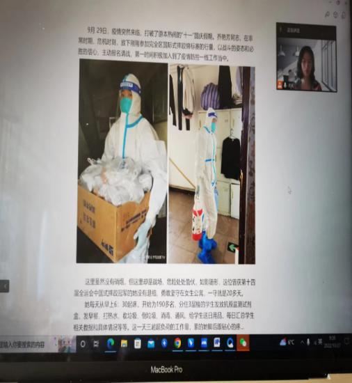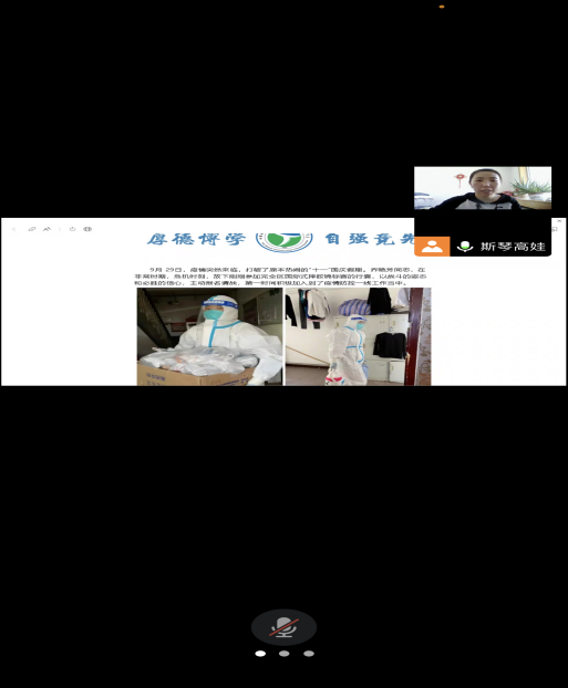 李景文老师组织以“爱”战“疫”、“寓”你相遇、“宿”说青春为主题的课程思政教学,讲述学院抗“疫”一线的领导、老师别父母、舍儿女,不顾个人安危坚守岗位,昼夜奋战、无私奉献、共克时艰最美逆行者的感人故事!分享了学院老师“居家抗疫舒缓情绪”的心理辅导活动和学生们“疫”起运动为主题的宿舍健身大赛,引导学生积极抗击疫情。课上拓展了抗“疫”相关的一些英语表达,灵活地将教学与抗“疫”精神融合。