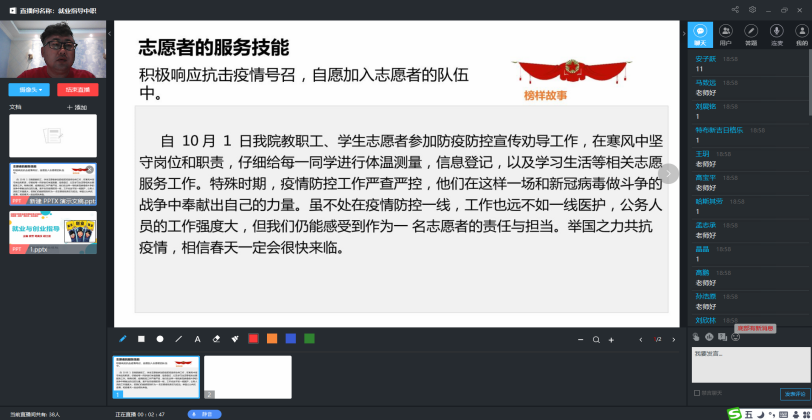 李灏老师在讲授志愿者服务技能的课程内容时融合抗击疫情,引导学生理解志愿者和防控一线抗“疫”人员的辛苦付出,鼓励学生积极配合疫情防控。