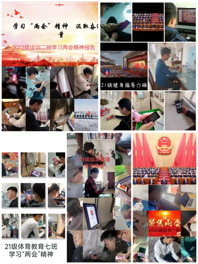 学院各党总支、党支部组织党员及所辖部门的党外人士、教职工,开展学习传达全国“两会”精神。重点学习“两会”期间习近平总书记重要讲话;政府工作报告的主要内容,全国人大常委会、全国政协常委会工作报告和“两高”报告关于体育、教育的内容。