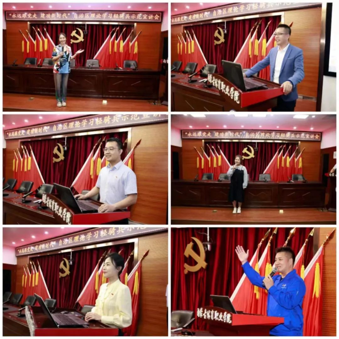 自治区理论学习轻骑兵示范宣讲团第五小分队莫伶、乌日娜、郭永兴、马斌、白蕊欣、康佟六位宣讲团老师结合自身奋斗故事、学习感悟、生动详实的案例,多角度、多层面,以“小切口”、“身边事”,讲述了习近平新时代中国特色社会主义思想指导实践的成功经验。六位老师都奋战在基层工作一线,他们中有3位是奋战在自治区高校的老师,有最美退役军人、有第三代兵工人、有有为青年学生,都是各自工作岗位上佼佼者。宣讲报告理论紧密联系实际,既有理论高度、思想深度,又有人生厚度、情感温度,是一场催人奋进的思政大课。