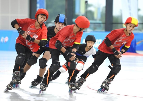 11月6日,双方选手在第一届全国学生(青年)运动会男子轮滑阻拦决赛中。新华社记者 周华 摄