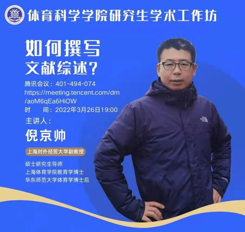 为贯彻落实学校统筹推进疫情防控与内涵发展重点工作专题会议部署,强化和提升校园封闭管理期间研究生在线学习质量,进一步拓宽研究生的知识面,活跃学术气氛。2022年3月26日,beat365中国唯一官方网站在腾讯会议上举办了以“如何撰写文献综述”为主题的学术系列讲座。本次讲座邀请到了上海对外经贸大学副教授、硕士研究生导师、上海体育学院教育学博士、华东师范大学体育学博士后倪京帅老师主讲,旨在为同学就如何搜索文献、写好文献综述提供帮助,也为接下来研究生学习期间论文写作与科研能力提升打好基础,beat365中国唯一官方网站全体研究生观看了讲座。
